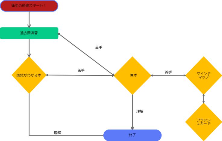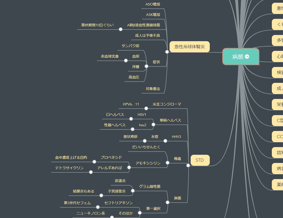 薬理の勉強法でも言いましたが、マインドマップを使った勉強法をオススメします。